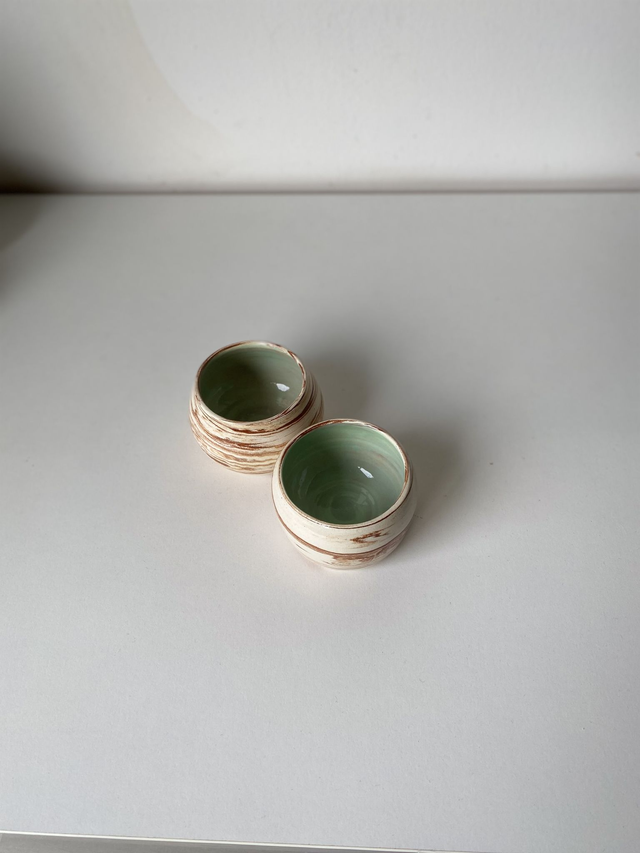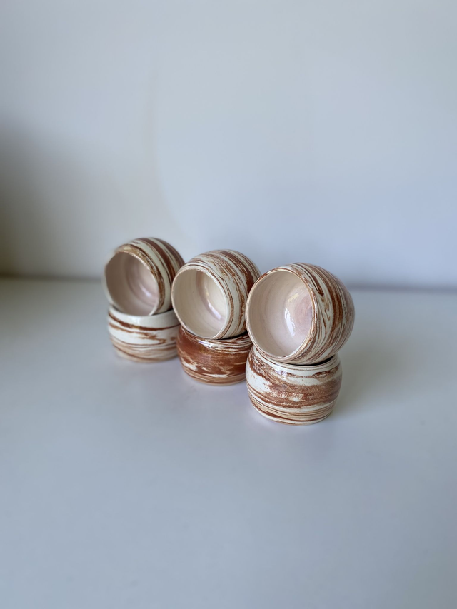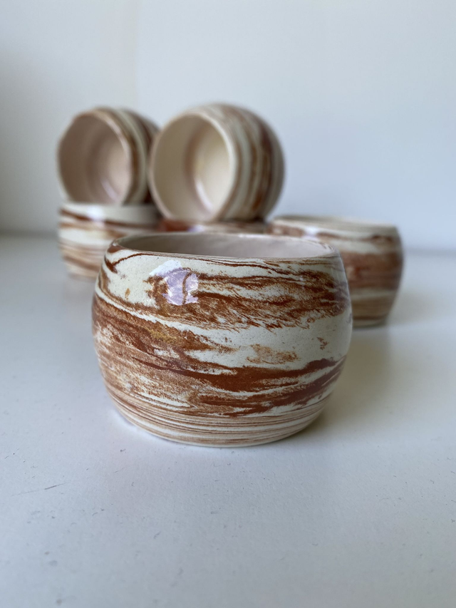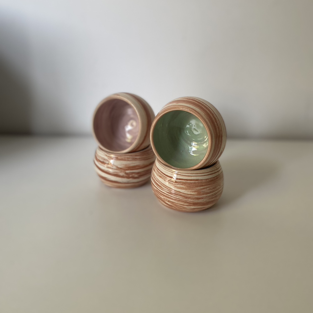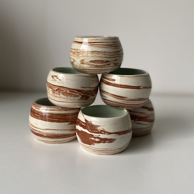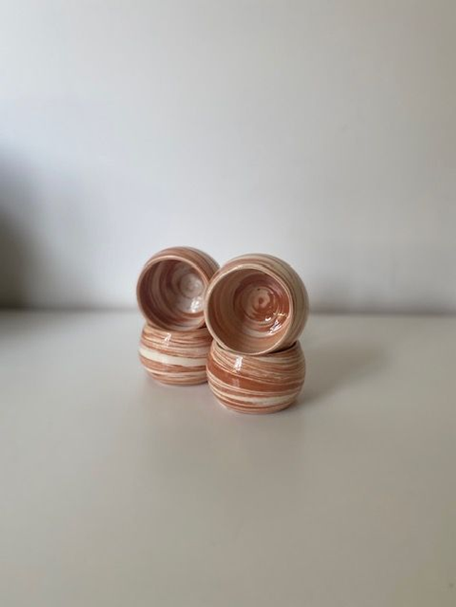 Tournées à la main en faïence selon la technique de la terre mêlée, ces petites tasses espresso présentent un mélange naturel de blanc et de terracotta. Chaque pièce est unique : la marbrure, le rythme des lignes et la composition varient légèrement d’une tasse à l’autre.